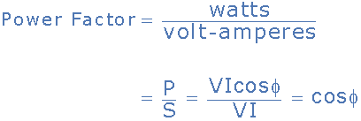 역률은 전류와 전압 파형 사이의 위상각을 정의하며, I와 V는 전류와 전압의 rms 값 크기입니다. 위상각이 전압에 대한 전류의 차이인지, 아니면 전류에 대한 전압인지는 중요하지 않습니다. 수학적 관계는 다음과 같이 주어진다.