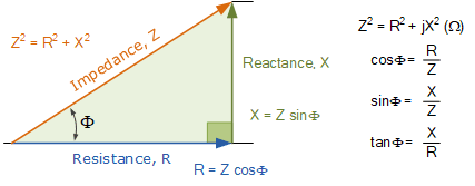저항과 리액턴스의 벡터합인 임피던스는 크기(Z)뿐만 아니라 저항과 리액턴스의 위상차를 나타내는 위상각(Φ)도 갖는다는 점에 유의하세요. 또한 주파수가 변함에 따라 리액턴스(X)의 변화로 인해 삼각형의 모양이 변경된다는 점에 유의하세요. 물론 저항(R)은 항상 일정하게 유지됩니다.