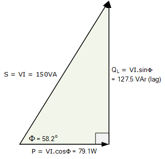 이 간단한 예의 전력 삼각형 관계에서 알 수 있듯이 0.5263 또는 52.63% 역률에서 코일은 79W의 유용한 작업을 생성하기 위해 150VA의 전력이 필요합니다. 즉, 역률이 52.63%일 때 코일은 동일한 작업을 수행하는 데 약 89% 더 많은 전류를 소비하며 이는 많은 전류 낭비입니다.