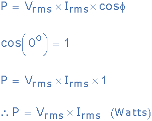앞서 순수 저항성 회로에서는 전류 파형과 전압 파형이 동위상이므로 위상차가 0도(0o)이므로 소비되는 실제 전력은 피상 전력과 동일하다고 말했습니다 . 따라서 역률은 다음과 같습니다.