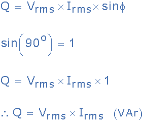 순수 리액턴스(유도성 또는 용량성)의 전압과 전류 파형 사이에는 90o 위상차가 있으므로 V*I에 sin(Φ)을 곱하면 각각 90o 위상차가 나는 수직 성분 이 생성 됩니다 . 기타, 그래서: