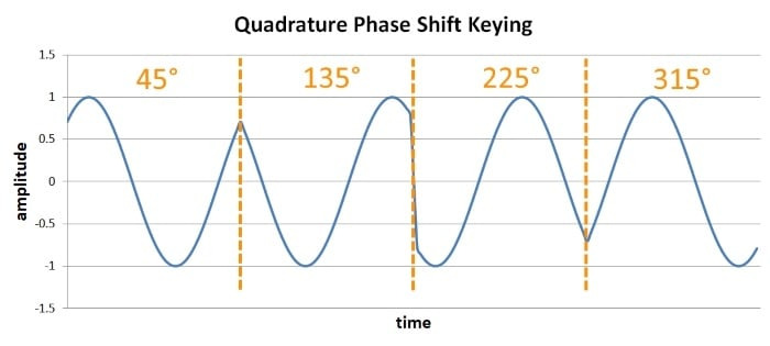 - 구적위상 편이 방식은 더 복잡하지만 데이터 전송속도가 두 배입니다(또는 절반의 대역폭으로 동일한 데이터 전송속도를 달성합니다).