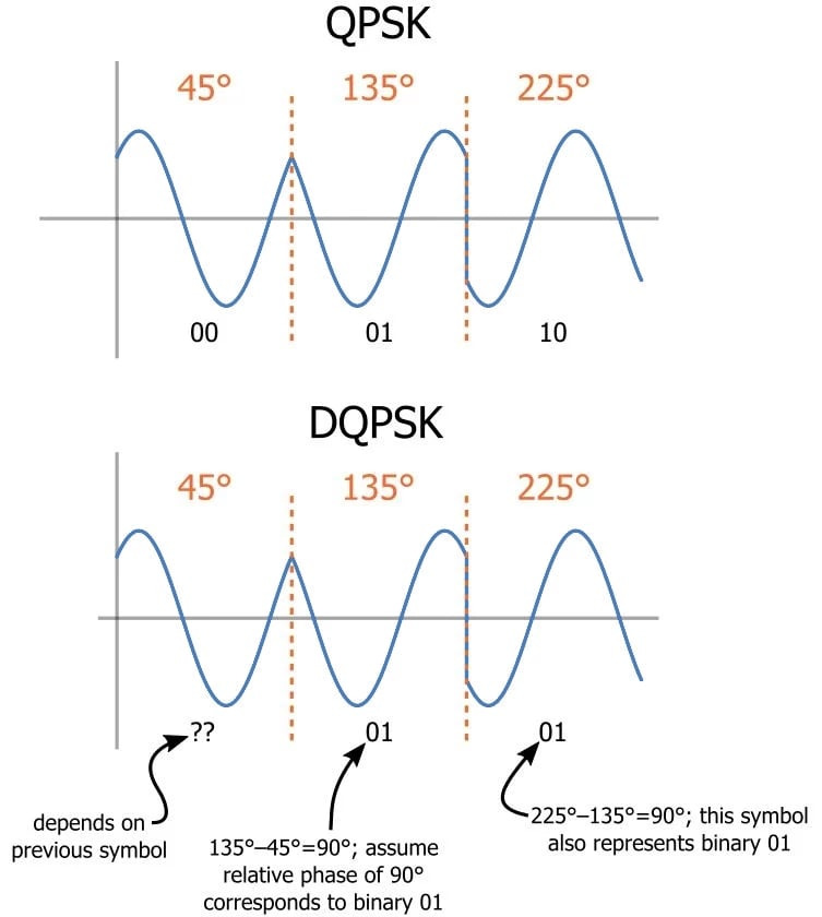 차등 QPSK(DQPSK)는 비코히어런트 수신기(즉, 복조 발진기와 변조 발진기를 동기화하지 않는 수신기)와 호환되는 변형입니다. 차등 QPSK는 이전 심볼에 대해 특정 위상 편이를 생성하여 데이터를 인코딩합니다 . 이런 방식으로 이전 심볼의 위상을 사용함으로써 복조 회로는 수신기와 송신기에 공통인 레퍼런스를 사용하여 심볼의 위상을 분석합니다.