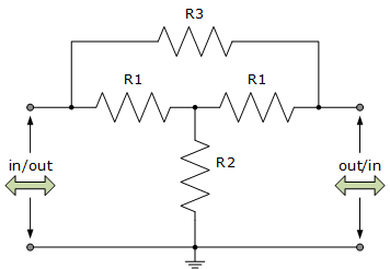 저항기 R3은 표준 T 패드 감쇠기에 걸쳐 브리지 네트워크를 형성합니다. 2개의 직렬 저항 R1 은 소스/부하 라인 임피던스와 동일하도록 선택됩니다. T 패드 사촌에 비해 브리지 T 감쇠기의 주요 장점 중 하나는 브리지 T 패드가 전송선 특성 임피던스에 일치하는 경향이 있다는 것입니다.