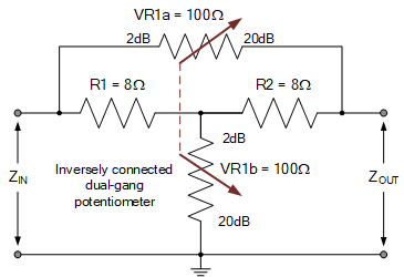 그러나 필요한 감쇠량을 찾기 위해 두 개의 서로 다른 전위차계를 한 번에 하나씩 조정하는 대신 두 전위차계를 기계적으로 연결된 하나의 100Ω "이중 갱" 전위차계로 교체하여 각 저항의 값이 역으로 변하도록 할 수 있습니다. 다른 하나는 전위차계가 아래와 같이 2dB에서 20dB로 조정되기 때문입니다.