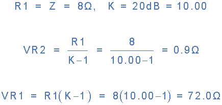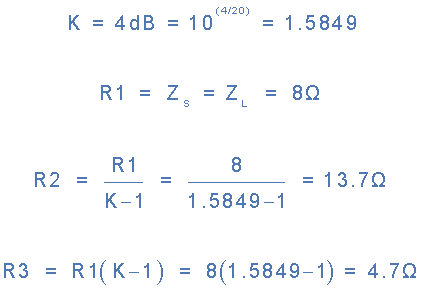 그런 다음 저항 R1 은 라인 임피던스 8Ω과 같고, 저항 R2 는 13.7Ω, 브리징 저항 R3 은 4.7Ω 또는 가장 가까운 권장 값과 같습니다.