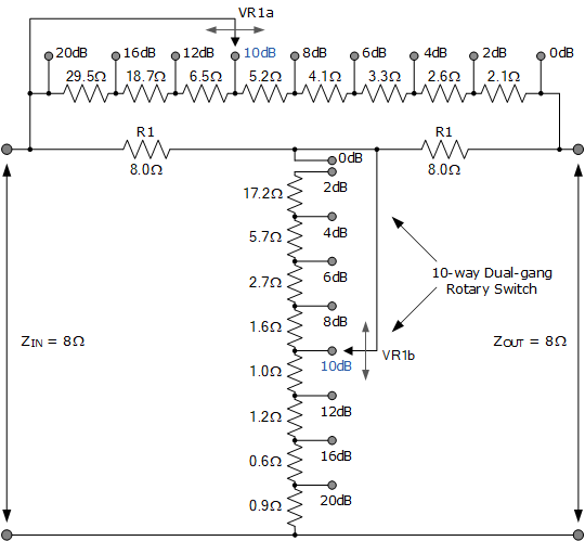 이 아이디어를 한 단계 더 발전시키면 전위차계를 고정 값 저항과 집단 회전 스위치, 로커 스위치 또는 푸시 버튼 스위치로 교체하고 적절한 저항으로 전환하여 감쇠가 가능한 브리지-T 감쇠기 회로를 생산할 수도 있습니다. 단계적으로 늘리거나 줄일 수 있습니다. 예를 들어, 위의 8Ω 전송선 임피던스 예를 사용합니다.