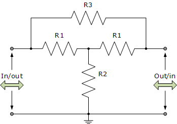 이름에서 알 수 있듯이 브리지 T 감쇠기에는 표준 T 패드 감쇠기의 두 직렬 저항기에 걸쳐 브리지 네트워크를 형성하는 추가 저항 요소가 있습니다.