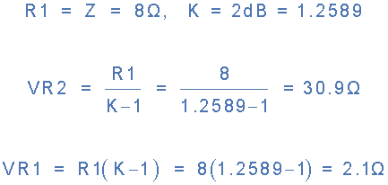 따라서 위의 예를 사용하십시오. 가변 브리지 T 감쇠기가 8Ω 오디오 라인에서 작동하고 -2dB에서 -20dB까지 감쇠 조정이 가능하도록 하려면 다음과 같은 저항 값이 필요합니다.