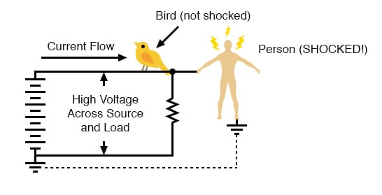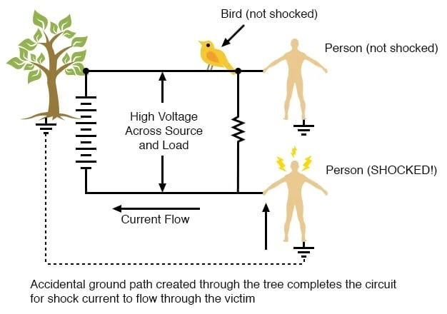 이것은 단 하나의 전선만 만져서 전기 충격을 받는 것은 불가능하다고 믿게 만들 수 있습니다. 새와 마찬가지로, 우리가 한 번에 단 하나의 전선만 만진다면 안전할 것입니다, 맞습니까? 불행히도, 이것은 정확하지 않습니다. 새와 달리, 사람들은 "살아있는" 전선에 닿을 때 보통 땅에 서 있습니다.