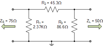 출력 임피던스가 75Ω인 무선 송신기와 임피던스가 50Ω인 전력 신호 강도 측정기 사이의 신호를 6dB만큼 감쇠하려면 불균형 비대칭 Pi-pad 감쇠기 회로가 필요합니다. 필요한 저항기의 값을 계산합니다.