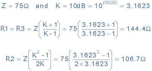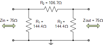 75Ω 네트워크의 임피던스를 매칭시키면서 오디오 신호 레벨을 10dB 감소시키기 위해서는 Pi-pad 감쇠기 회로가 필요합니다. 필요한 세 개의 저항기 값을 계산합니다.