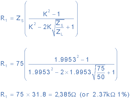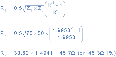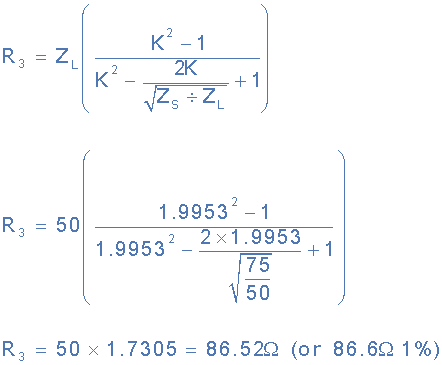 위에서 언밸런스 Pi-pad 감쇠기에 대해 계산된 값을 사용하면 두 개의 직렬 저항과 병렬 션트 저항에 대해 직렬 저항 R2 = 106.7 2 = 53.4Ω , R1, R3 = 144.4Ω 이 이전과 동일하게 됩니다.