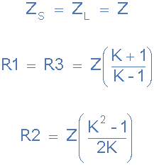 이전에 파이 패드 감쇠기는 수동 저항 요소로만 구성된 대칭형 감쇠기 설계로 설계 시 선형이 되어 입력 및 출력 단자가 서로 바뀔 수 있다고 말했습니다. 따라서 파이 패드 감쇠기는 두 개의 동일한 임피던스( Z S = Z L ) 사이에 삽입하여 신호 레벨을 줄이는 데 이상적입니다.