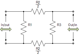 Balanced -Pi 감쇠기 또는 줄여서 "Balanced-π Attenuator"는 공통 접지선에 추가 저항 요소를 사용하여 아래와 같이 균형 잡힌 저항 네트워크를 형성합니다.