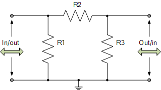 Pi -pad 감쇠기는 기본 레이아웃과 디자인이 그리스 문자 파이(π)와 유사하기 때문에 그렇게 불립니다. 즉, 입력과 출력에서 접지되는 직렬 저항기 1개와 병렬 션트 저항기 2개가 있다는 의미입니다.