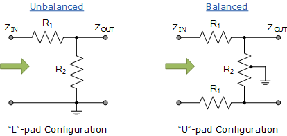 L-패드 감쇠기는 두 개의 저항 요소로만 구성된 가장 간단한 감쇠기 설계이며 일반적으로 전압 분배기 회로로 알려져 있습니다. L- 패드 감쇠기는 한 방향으로만 임피던스 매칭이 가능한 불균형 비대칭 감쇠기 회로입니다. "L 패드 감쇠기"에 해당하는 밸런스드 장치를 U 패드 감쇠기 라고 합니다 .
