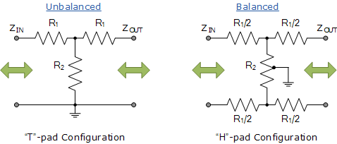 T-패드 감쇠기는 구성 이 문자 "T"와 비슷하기 때문에 그렇게 불립니다. "T-패드 감쇠기"는 동일한 임피던스 간의 감쇠 또는 불평등한 임피던스 간의 임피던스 매칭에 사용할 수 있는 대칭형 감쇠기입니다. 감쇠가 높으면 병렬 션트 암 임피던스가 작아집니다. T-패드 감쇠기 에 해당하는 밸런스드 제품을 H-패드 감쇠기 라고 합니다 .