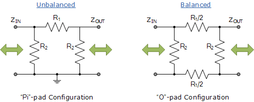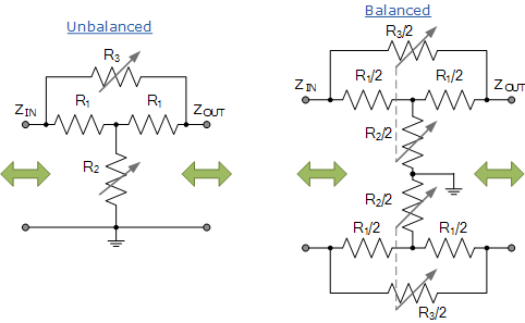 패시브 감쇠기는 형태가 대칭이거나 비대칭일 수 있으며 밸런스형 또는 언밸런스형일 수 있습니다. 일반적인 수동 감쇠기 회로에는 아래와 같이 "T형", "Pi형" 및 "Bridged-T" 유형이 포함됩니다.