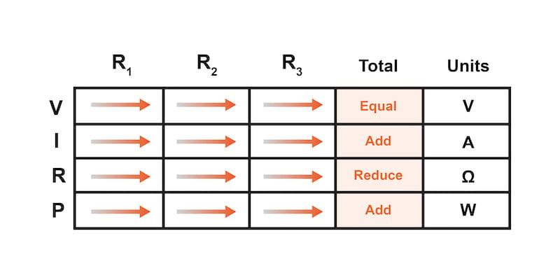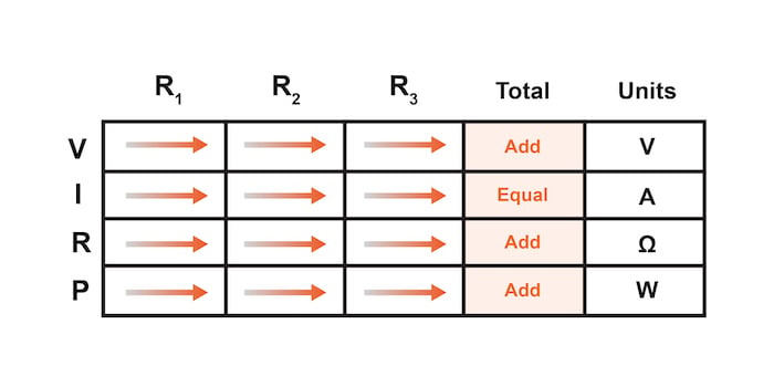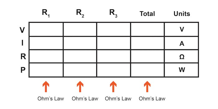 이와 같은 표를 사용하여 모든 전압, 전류 및 저항을 나열하면 옴의 법칙 방정식을 어디에 사용할 수 있는지 명확하게 정의하는 데 도움이 됩니다. 직렬 및 병렬 회로의 원리에 따라 열을 가로질러 값을 도출하는 것은 허용됩니다.