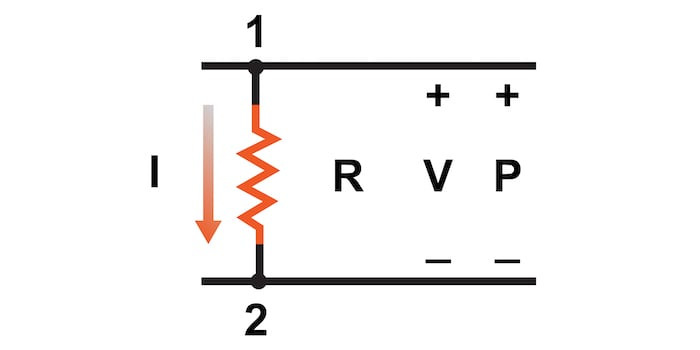 위 그림에서 전압(V), 전류(I), 저항(R), 전력(P) 간의 관계는 동일한 두 회로 노드 1과 2로 제한됩니다.