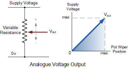 이것은 아날로그 회로입니다. 전위차계의 출력은 와이퍼 단자가 회전함에 따라 변화하여 0V와 VMAX 사이에서 무한한 수의 출력 전압 포인트를 생성 합니다 . 출력 전압은 한 값에서 다음 값으로 천천히 또는 빠르게 변할 수 있으므로 두 전압 레벨 사이에 급격한 또는 단계적 변화가 없어 지속적으로 가변적인 출력 전압을 생성합니다. 아날로그 신호의 예로는 온도, 압력, 액체 수위, 광도 등이 있습니다.