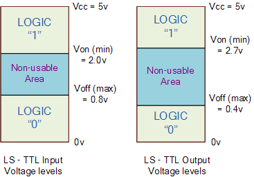 일반적으로 하나의 전압 레벨인 ">0"에서 "1"로 또는 "1"에서 "0"으로의 전환은 논리 회로의 잘못된 전환을 방지하기 위해 가능한 한 빨리 이루어집니다. 표준 TTL(트랜지스터-트랜지스터-로직) IC에는 아래와 같이 논리 "1" 값과 논리 "0" 값이 정확히 무엇인지 정의하기 위한 사전 정의된 입력 및 출력 전압 제한 범위가 있습니다.