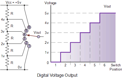 이 디지털 회로 예에서 전위차계 와이퍼는 직렬 저항 체인의 각 접합부에 차례로 연결되어 기본 전위 분배기 네트워크를 형성하는 단일 회전 스위치로 대체되었습니다.