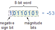 하지만 우리가 가진 것이 1과 0의 묶음뿐이라면 어떻게 부호 있는 이진수를 표현할 수 있을까요? 우리는 이진수 또는 비트가 "1" 또는 "0"의 두 가지 값만 가지며 편리하게도 기호에도 " + " 또는 " - "의 두 가지 값만 있다는 것을 알고 있습니다.