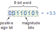 그런 다음 SM(Sign-and-Magnitude) 표기법이 "n" 총 비트를 두 부분으로 나누어 양수 및 음수 값을 저장한다는 것을 알 수 있습니다. 즉, 부호용 1비트와 순수 이진수 값용 n-1비트입니다. 숫자. 예를 들어, 10진수 53은 다음과 같이 8비트 부호 있는 이진수로 표현될 수 있다.