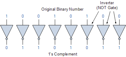 디지털 산술 또는 논리 디코더 회로를 구축할 때 부호 있는 이진수의 1의 보수를 찾는 가장 쉬운 방법은 인버터를 사용하는 것입니다 . 인버터는 당연히 보수 생성기이며 병렬로 사용하여 표시된 대로 임의의 이진수의 1의 보수를 찾을 수 있습니다.