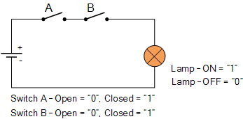 여기에서는 두 개의 스위치 A 와 B가 함께 연결되어 직렬 회로를 형성합니다. 따라서 위의 회로에서 램프를 켜려면 스위치 A 와 스위치 B 가 모두 닫혀야 합니다(논리 "1"). 즉, 램프가 "ON"이 되려면 두 스위치가 모두 닫혀 있거나 논리 "1"에 있어야 합니다.