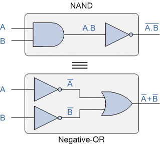 그러면 여기서 각 입력에 인버터(게이트 아님)가 있는 표준 OR 게이트 기능이 NAND 게이트 기능과 동일하다는 것을 알 수 있습니다 . 따라서 개별 NAND 게이트는 NAND 게이트 의 등가성이 음의 OR이므로 이러한 방식으로 표현될 수 있습니다.