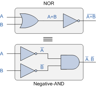 A+B 의 최상위 논리 게이트 배열은 입력 A 및 B를 사용하는 표준 NOR 게이트 기능을 사용하여 구현할 수 있습니다 . 하부 논리 게이트 배열은 먼저 두 입력을 반전시켜 A 와 B를 생성합니다 . 따라서 AND 게이트의 입력이 됩니다. 따라서 AND 게이트 의 출력은 다음과 같습니다. A . 비