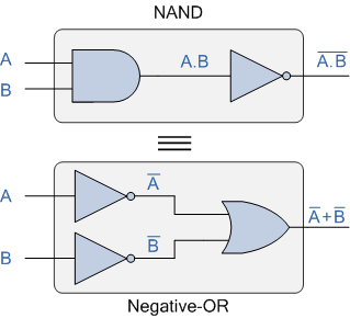 AB 의 상단 논리 게이트 배열은 입력 A 및 B 가 있는 표준 NAND 게이트를 사용하여 구현될 수 있습니다 . 하부 논리 게이트 배열은 먼저 A 와 B 를 생성하는 두 입력을 반전시킵니다 . 그런 다음 OR 게이트 의 입력이 됩니다 . 따라서 OR 게이트 의 출력은 다음과 같습니다. A + B