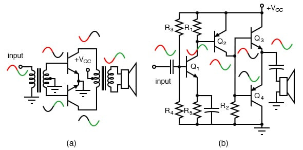 (a) 변압기 결합 푸시풀 증폭기. (b) 직접 결합 보완 쌍 증폭기는 변압기를 트랜지스터로 대체합니다.