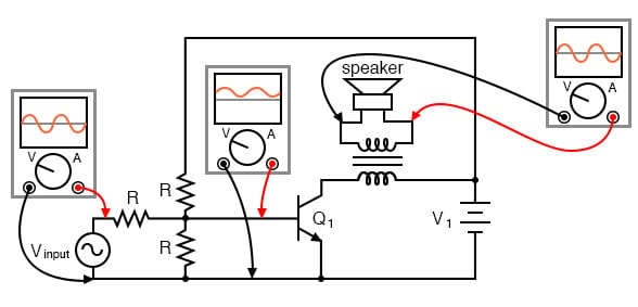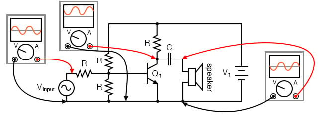 위 그림의 회로는 트랜지스터 컬렉터가 저항을 통해 배터리에 연결된 일반적인 공통 이미터 증폭기와 유사합니다. 커패시터는 고역 통과 필터 역할을 하여 대부분의 AC 전압을 스피커로 전달하는 동시에 모든 DC 전압을 차단합니다. 다시 말해, 이 커플링 커패시터의 값은 예상 신호 주파수에서 임피던스가 임의로 낮아지도록 선택됩니다.