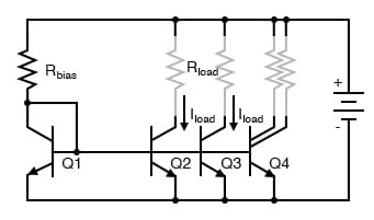 저항은 IC에서 제작할 수 있지만, 트랜지스터는 제작하는 것이 더 쉽습니다. IC 설계자는 부하 저항을 전류원으로 대체하여 일부 저항을 피할 수 있습니다. 개별 부품으로 구성된 연산 증폭기와 같은 회로는 트랜지스터 몇 개와 저항 여러 개를 갖습니다. 집적 회로 버전은 트랜지스터 몇 개와 저항 몇 개를 갖습니다. 아래 그림에서 하나의 전압 레퍼런스인 Q1은 여러 전류원(Q2, Q3, Q4)을 구동합니다. Q2와 Q3이 동일 면적 트랜지스터인 경우 부하 전류 I load는 동일합니다. 2·I 부하가 필요한 경우 Q2와 Q3을 병렬로 연결합니다. 더 나은 방법은 Q2의 두 배 면적을 가진 트랜지스터 하나를 제작하는 것입니다. 그러면 전류 I3은 I2의 두 배가 됩니다. 즉, 부하 전류는 트랜지스터 면적에 따라 달라집니다.