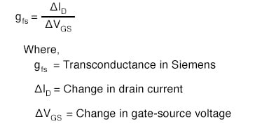 JFET는 전압 제어 전류 레귤레이터 이기 때문에 (적어도 액티브 상태에서 동작할 수 있을 때는), 고유 증폭률을 BJT처럼 단위 없는 비율로 표현할 수 없습니다. 즉, JFET에는 β 비율이 없습니다. 이는 다른 유형의 전계 효과 트랜지스터와 전자관을 포함한 모든 전압 제어 액티브 소자에 해당합니다. 그러나 제어되는(드레인) 전류와 제어되는(게이트-소스) 전압을 나타내는 표현이 있는데, 이를 트랜스컨덕턴스(transconductance) 라고 합니다 . 단위는 지멘스(Siemens)로, 컨덕턴스(이전에는 mho 로 알려짐 )와 동일한 단위입니다.