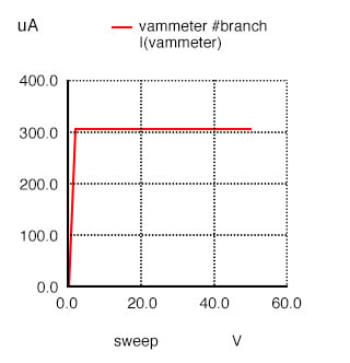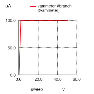 실제로 전원 공급 전압을 아무리 높게 조정하더라도 드레인 전류는 100µA(1.000E-04 암페어) 값으로 일정하게 유지됩니다.