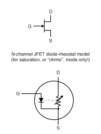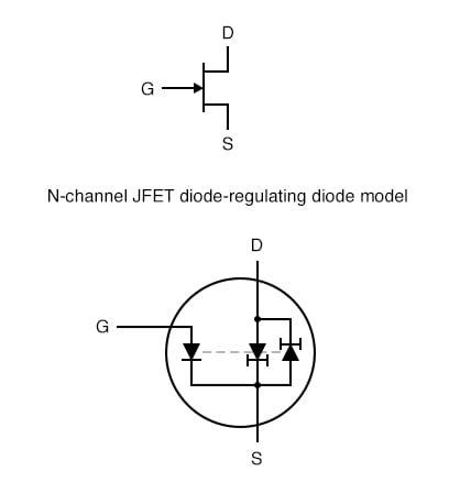 JFET의 경우, 역방향 바이어스된 게이트-소스 다이오드 양단의 전압 이 정전류 다이오드 쌍의 전류 조절점을 설정합니다 . 소스와 드레인 사이의 양방향 전류 흐름을 원활하게 하기 위해 한 쌍의 정전류 다이오드가 모델에 포함되어 있으며, 이는 채널의 단극성 특성으로 인해 가능합니다. 소스-드레인 전류가 이동할 PN 접합이 없기 때문에 제어되는 전류에 극성 감도가 없습니다. 이러한 이유로 JFET는 종종 양방향 소자라고 합니다.