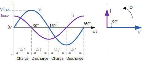 위의 파형에서 벡터 다이어그램에 표시된 것처럼 전류가 1/4 사이클 또는 90 ° 만큼 전압을 앞서는 것을 볼 수 있습니다. 그렇다면 순수 용량성 회로에서는 교류 전압이 전류보다 90o 뒤처진 다고 말할 수 있습니다 .