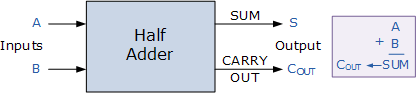 그러면 단순 덧셈기의 연산에는 표시된 대로 방정식의 합계(S)와 캐리(C) 비트라는 두 개의 출력을 생성하는 두 개의 데이터 입력이 필요합니다.