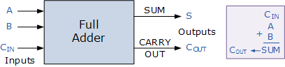 전가산기 와 이전 반가산기 의 주요 차이점은 전가산기에는 3개의 입력이 있다는 것입니다. 이전과 동일한 두 개의 단일 비트 데이터 입력 A 및 B 와 아래에 표시된 것처럼 이전 단계에서 캐리를 수신하기 위한 추가 Carry-in ( C-in ) 입력입니다.