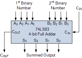 예를 들어, 두 개의 4비트 숫자를 "더하기" 원한다고 가정하면, 첫 번째 전가산기의 두 출력은 덧셈의 첫 번째 자리 숫자 합계( S )와 올림 역할을 하는 캐리아웃 비트를 제공합니다. 다음 이진 가산기의 숫자로.