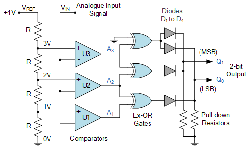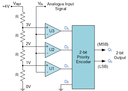 이제 2비트 ADC를 생성하는 경우 표시된 대로 4-2비트 인코더 회로에 필요한 4개의 디지털 값에 해당하는 4개의 서로 다른 전압 레벨이 필요하므로 "3" 비교기인 2 2 – 1이 필요합니다 . .