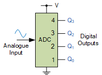 예를 들어 4비트 ADC는 15분의 1(2 4 – 1) 분해능을 갖는 반면, 8비트 ADC는 255분의 1(2 8 – 1) 분해능을 갖습니다. 따라서 아날로그-디지털 변환기는 알려지지 않은 연속 아날로그 신호를 가져와 이를 2n 비트의 "n" 비트 이진수로 변환 합니다 .