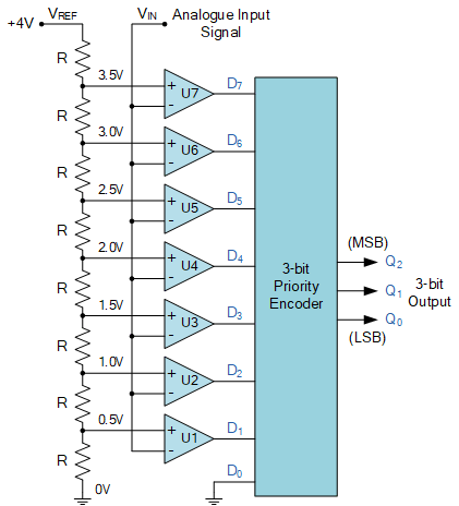 위의 병렬 ADC는 0V ~ 3V 범위의 아날로그 입력 전압을 변환하여 2비트 바이너리 코드를 생성합니다. 3비트 디지털 로직 시스템은 2 3 = 8개의 서로 다른 디지털 출력을 생성할 수 있으므로 아날로그 입력 전압은 8개의 기준 전압 레벨과 비교될 수 있으며 각 전압 레벨은 기준 전압의 1/8(V/8)과 같습니다. 따라서 이제 0.5(4/8)V의 분해능을 측정할 수 있으며 표시된 대로 000(0)과 111(7) 사이의 3비트 이진 코드 출력에 대해 2 3 – 1 비교기가 필요합니다.