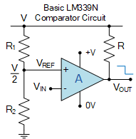 위의 간단한 예에서 V REF 는 R 1 및 R 2 에 의해 설정된 전압 분배기 네트워크에서 얻습니다 . 두 저항의 값이 동일한 경우(즉, R 1 = R 2 ) 기준 전압 레벨은 공급 전압의 절반, 즉 V/2와 같습니다. 따라서 오픈 컬렉터 출력을 갖는 비교기의 경우 V IN이 V/2보다 작으면 출력은 HIGH이고, V IN이 V/2보다 크면 출력은 1비트 ADC로 작동하는 LOW입니다.