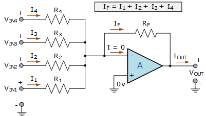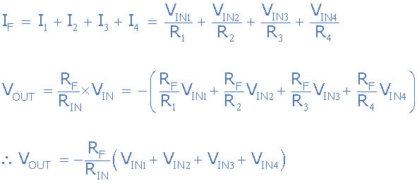 피드백 저항기에 의해 생성된 네거티브 피드백으로서 RF는 연산 증폭기의 반전 입력을 0 전위로 바이어스하므로 모든 입력 신호는 서로 전기적으로 효과적으로 절연되며 출력은 결합된 모든 입력 신호의 반전된 합이 됩니다.